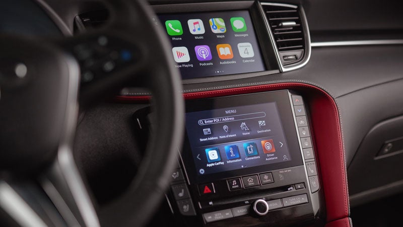 The INFINITI QX55 gives you INFINITI InTouch™ Services and wireless Apple CarPlay® or Android Auto™ integration standard in every trim. To access Navigation, choose the Essential or Sensory trims. For a glimpse at your car’s operations while en route, the Head-Up Display shows up on the windshield, available in the Essential trim, and already installed in the Sensory trim.